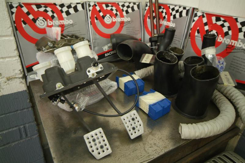 Well here we are with a few more parts from Michelotto. LM brakes and discs, LM magnesium pedal box with front/rear bias controller, LM anti roll bars, track rod ends (now fitted as per pic), carbon cooling ducts etc etc, but not the lightweight shocks and springs which we are still waiting for.Please Cristiano, we need them.