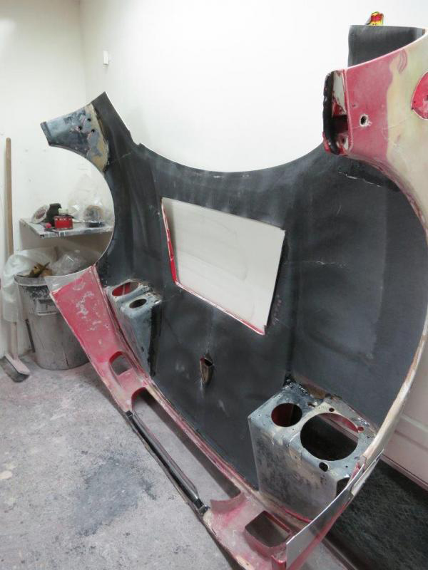Some further shots of the front clam.Here you can see our original clam before and midway through the restoration process. We have taken literally pounds of filler out of it, so much that you can easily tell the difference just by lifting it. It will be finished off with new arches and ductwork and then a final internal layer of Carbon Kevlar so it will be both lighter and stronger (and more beautiful) than where we started.