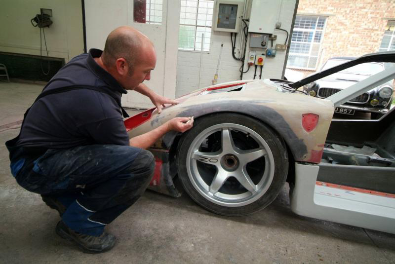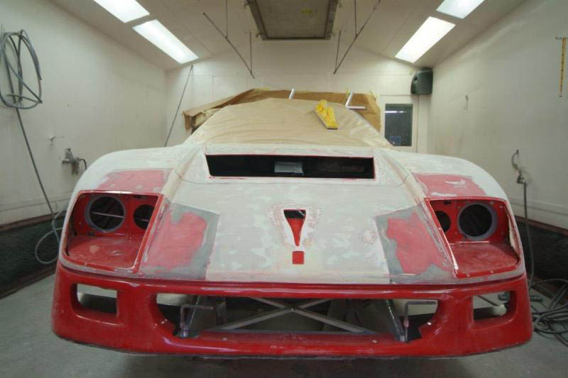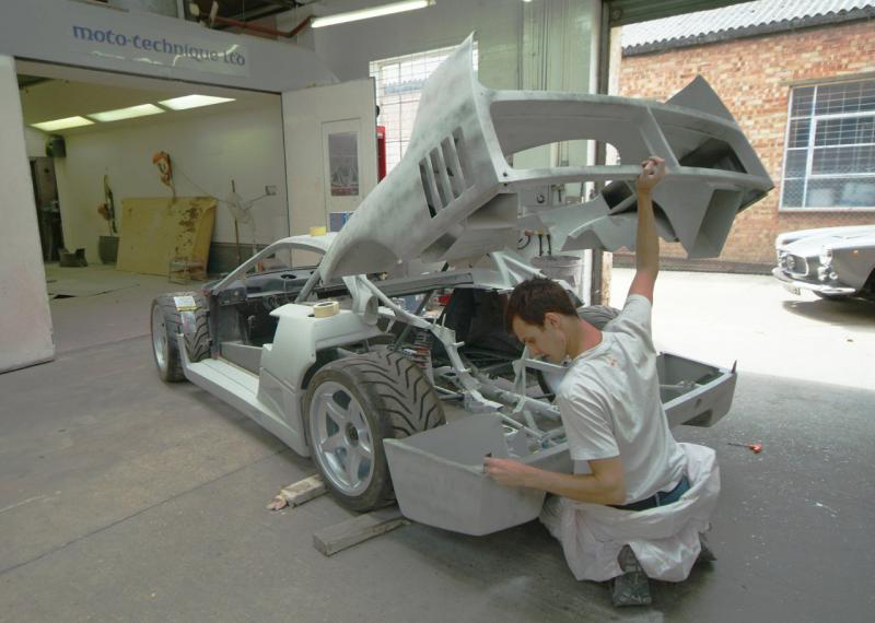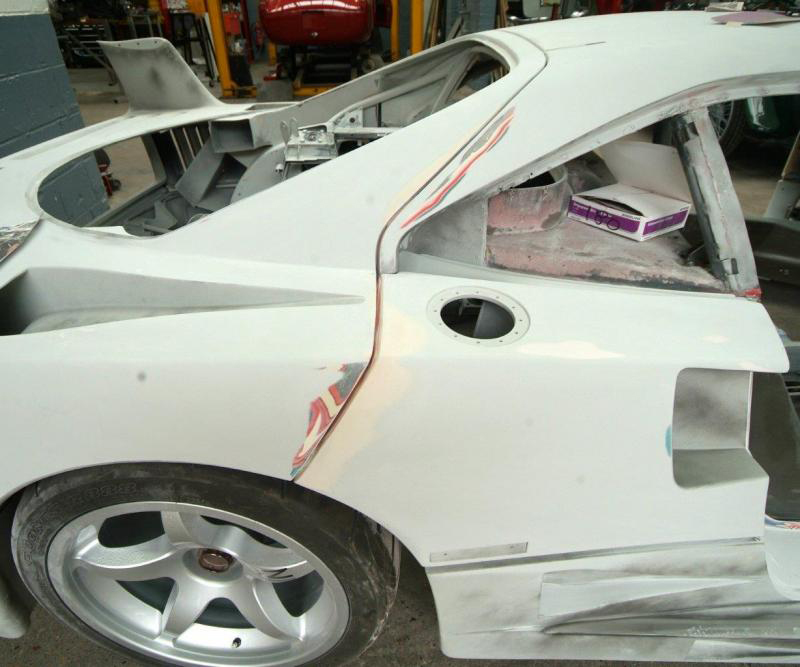 Meanwhile, for the first time in a long time excitingly the upper and lower rear clams are now finally in one colour. In case you thought they were destined for Chris Evan’s White collection, they are not but at least it is primer and I begin to feel we are coming out of this tearfully expensive hole. These sort of jobs are quite draining in more ways than one as you keep on having to write out cheques and yet the car looks worse and worse and it gets more and more depressing until you finally reach bottom and start to climb out and I think that is almost where we are. Maybe another two weeks to be confident that it is all not a waste of time, effort and money but now beginning to feel more positive.Work continues on the front clam but still a week or so away from primer as so much detailed work on wheel arches and all the Kevlar ductwork which is quite extensive on the LM. That should be a work of art when finished and be interesting post before and after shots.