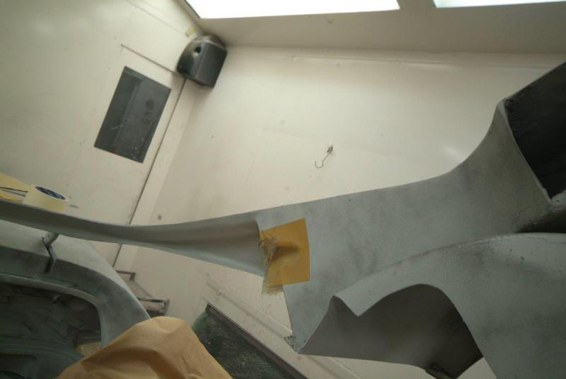You will all be relieved to see that you never have to look at any more shots of the multi-hued front clam undergoing work (except on the underside) and it is finally close to joining the other panels in grey primer. This polyester spray filler bonds the various substrates and then into the oven before final finishing and grey primer tomorrow. Relief.Thanks Greg for you post and after all this work I too really do hope it pays off in years of enjoyment-this is a long haul and if you read back through the thread there was a stage I thought it would be over in 4 months. Ridiculous knowing myself and my goals.