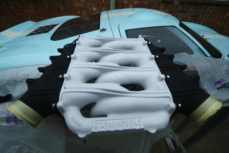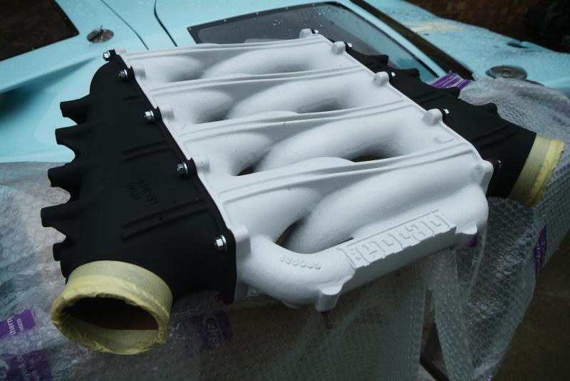 Just look what the Postman surprised us with today – our Zircotec treated inlet manifolds!For those who are unaware, Zircotec is a ‘plasma-sprayed ceramic coatings to protect components from the effects of fire, heat, wear, abrasion and corrosion’. In this instance it will help keep our charged inlet air at a lower temperature which means ‘increased engine performance, eg. a 30 degree C drop in intake air temperature can deliver a 6% increase in power, or can increase engine efficiency leading to less fuel usage’.Used extensively in F1, Nascar, GT racing, Classic cars etc, this hot engine bay seems to be the place to use it and we will also be applying their process to both our exhaust manifolds and hot side of the Turbos.Another work of art to be set alongside the Carbon tanks, Michelotto suspension etc.Yet again, note the background car, yet another classic into their shop for a bit of work.