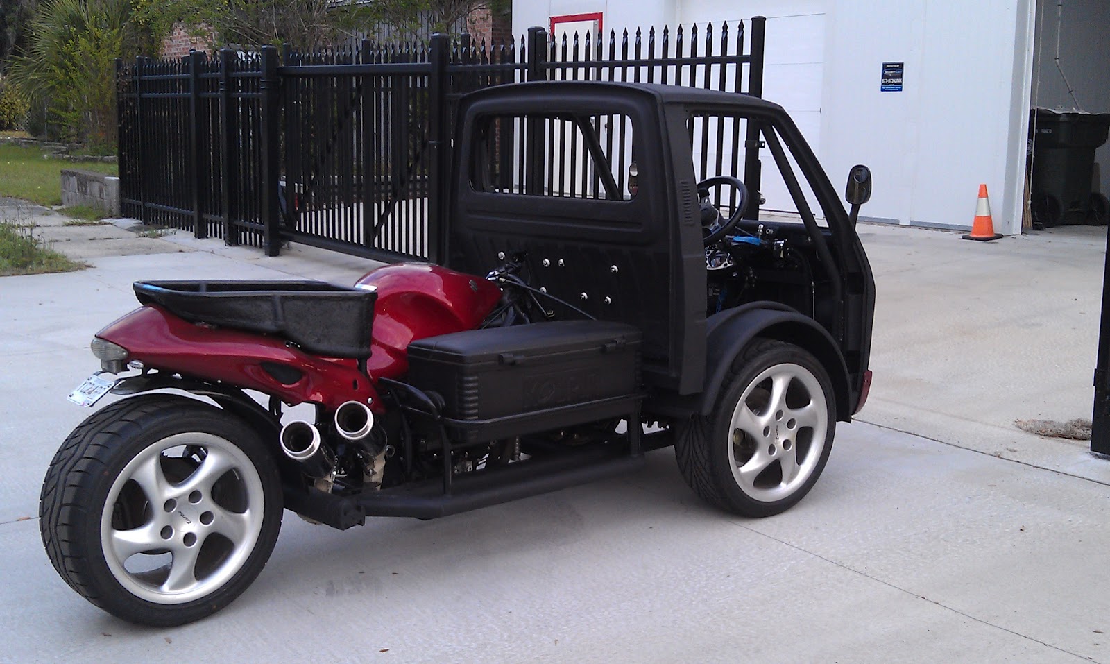 Just when I thought I’d seen every kind of build combination make it’s way into my inbox, along comes Ben and his one-off creation. I can confidently say “one-off” because I don’t think anyone else out there would be crazy enough to turn a Hayabusa into a reverse-trike, then mount a Suzuki Carry body on the front end, and set it off with 3 Porsche twists.