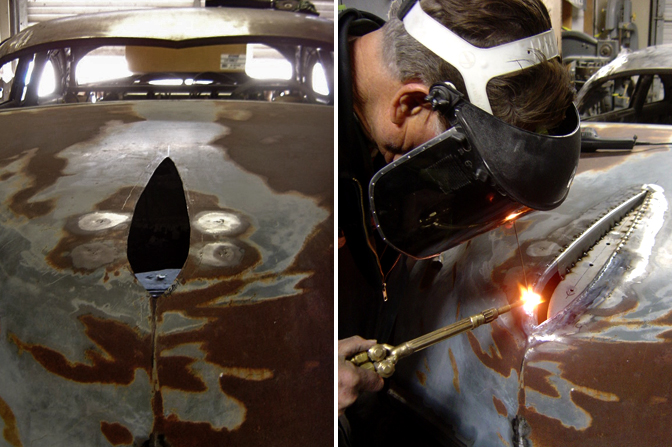 Here’s Gene in the process of welding a frenched base for the hood ornament.