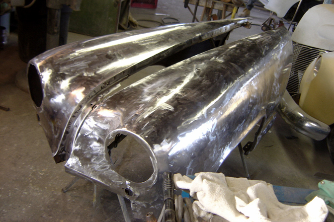 Bare metal fenders being massaged to perfection, so close to being covered in fade-style paint job along with the rest of the body. Which do you prefer? Painted and glossy, or raw metal?
