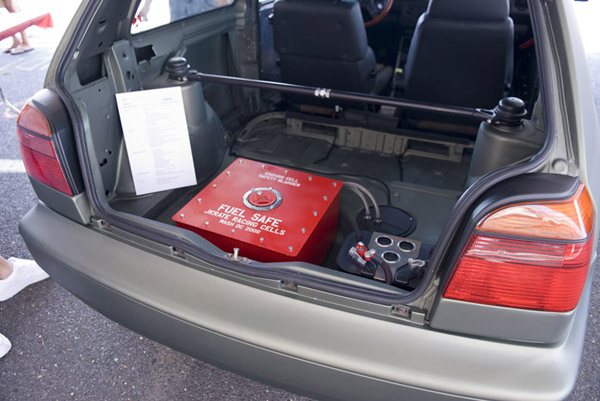 One such ride is Roxy the Mk3 Golf, a themed build with a vintage racing/bobber Harley feel, the real highlights are in the details. Check out the seats, custom fuel-cell, hinged in-dash gauge pods, hand-made badge, vintage cloth wrapped spark leads, etc etc.