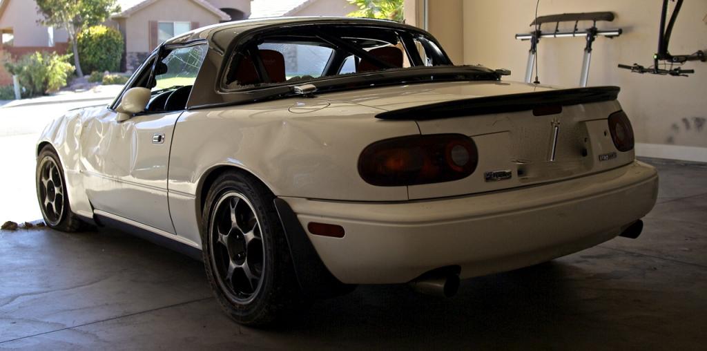 Imagine for a second that you just bought a car, but that car was located 1800 miles away, meaning you had to travel that distance to collect the car, and then drive it all the way back home. Now, keep your imagination going, and ponder how you’d feel if that same car got stolen from your driveway less than one week after you bought it. Pretty shattering, right? Well, what if it wasn’t just stolen, but also crashed, flipped, and completely totaled by the theif? I think I’d curl up in a ball and just cry. But not Jeff, the owner of this turbo’d Mazda Miata/MX5. After taking a week to grieve, he sought about buying a replacement car and rebuilding it piece by piece, ensuring no dirty or unpainted/polished product so much as touches the car. It culminates in one of the cleanest MX5’s on the planet, better than when it rolled off the production line.