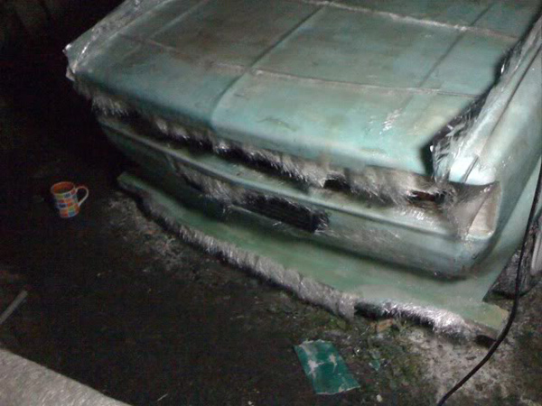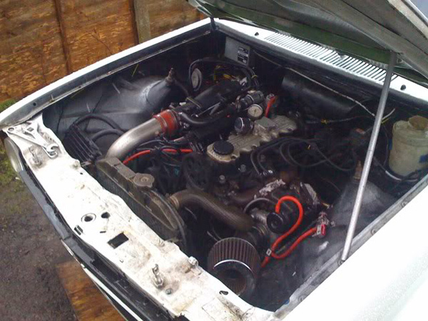 This is the build he was telling me about. A ’78 Kadett with a turbo setup, E30 BMW IRS rear end, custom fibreglass front clip, and a whole bunch of DIY mods done at home on a student budget with a $100 welder. A true home-build, complete with a work related injury.