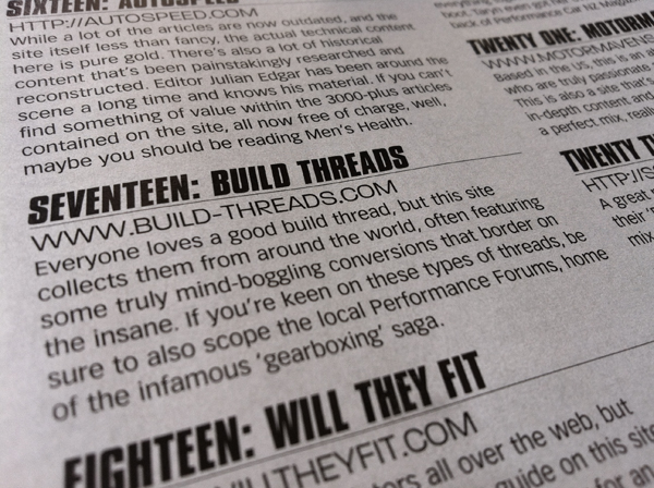 The latest issue of Aussie mag Performance Imports features a list of their choice of the 30 best automotive blogs and websites (which pretty much resembles my bookmarks folder). I was very excited to see my own humble site sitting proudly at No 17…