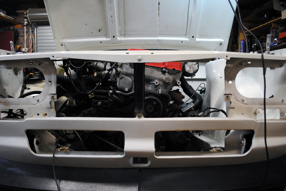 Next the (huge) radiator was removed, giving a full view of the engine from the front end. I needed a smaller radiator as my current one took up all the width between the chassis rails, so I had nowhere to run intercooler piping.