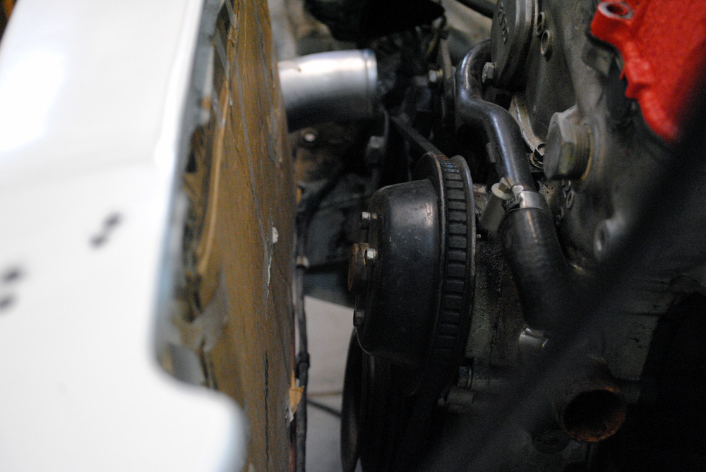 Moving around to the back of the intercooler (with cardboard to protect the fins) you can see why the water pump needs to be removed. In the space between the ‘cooler and engine I still need to fit a radiator and a thermo fan or two. There is just no room to mount all these items and keep the intercooler behind the grille. The only solution is to remove the belt driven pump and go with an electric one mounted off to the side of the engine.