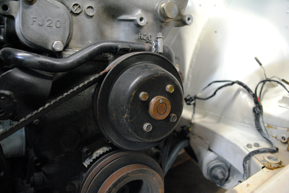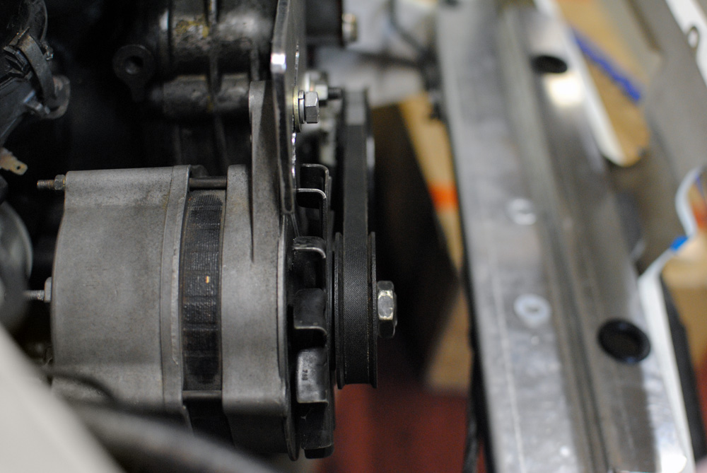 My next call to action was to shave off some of the material on the plastic shroud around the thermo fan, but even this didn’t give me the clearance I needed. I think this is due to my engine mounts and how they position the motor in the bay, from what I can tell my engine sits a bit further forward than other FJ 1600’s, as some other people run this radiator and don’t have the clearance issues I have. After yet more research I decided my only choice was to mount the alternator 20mm rearwards so the belt would use the groove on the crank pulley which is closest to the engine, and then have the other groove machined off.