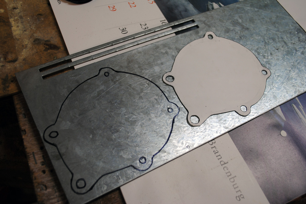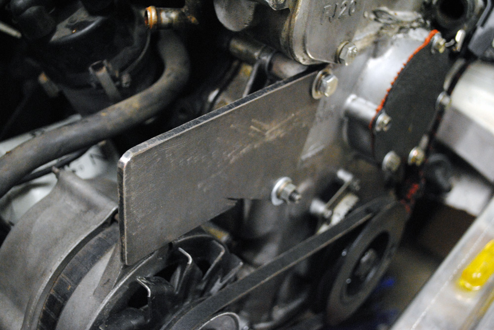 Another item I had to make for the alternator was the upper adjusting bracket. Again, I started with some 5mm scrap metal, spaced it off the engine until it was in the right position. (v1 waterpump blockoff plate pictured)