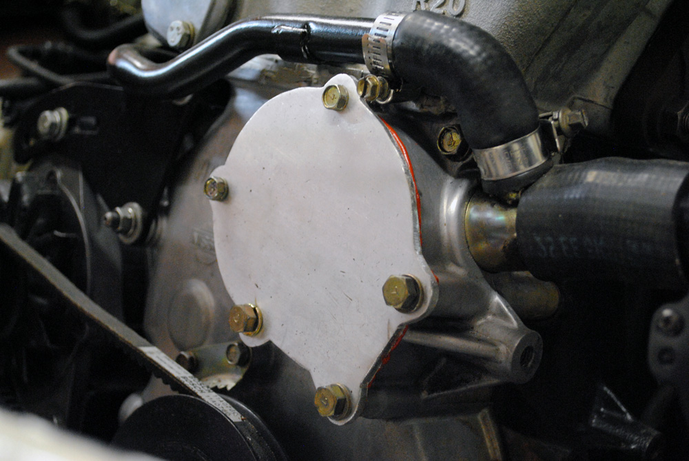 To stop water spewing out everywhere, I needed to block off the gaping hole in the front of my engine. To keep costs down I decided to make my own block-off plate. I first made a paper template, traced it onto some 3mm galvanised plate that I found in the garage, and then cut it out with an angle grinder. After bolting this up to the car I started to have second thoughts about my material choice once I learnt that people were selling block-off plates much thicker than mine.