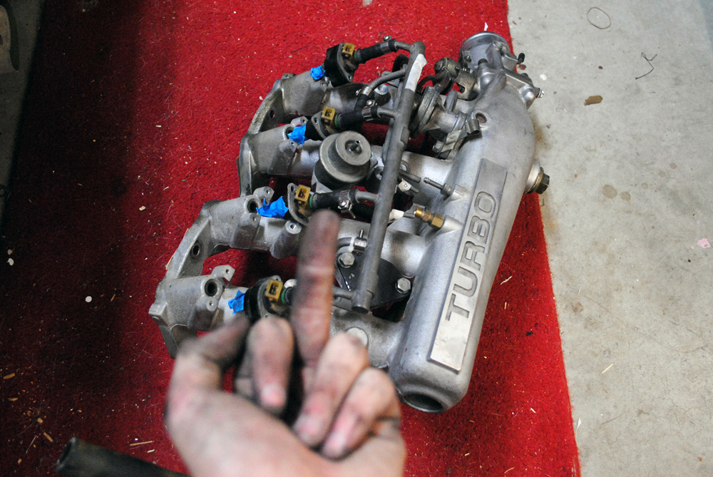 My next job was to remove the intake manifold. The reason the intake manifold needs to be modified is because from the factory, the manifold is cast with the throttle body flange pointing towards the middle of the car (see above). When adding an intercooler, to make routing the piping possible the manifold needs to be cut just behind the T/B flange and then re-welded at a new angle so it either comes out straight or points towards the outside of the car.