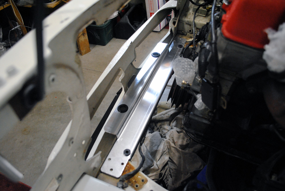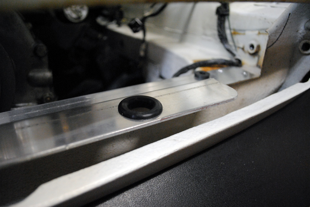 The mounting plate dropped into it’s rough position. The smaller rubber o-rings locate a pair of dowels underneath the radiator, while the larger ones locate the threaded inserts found on most generic intercoolers.