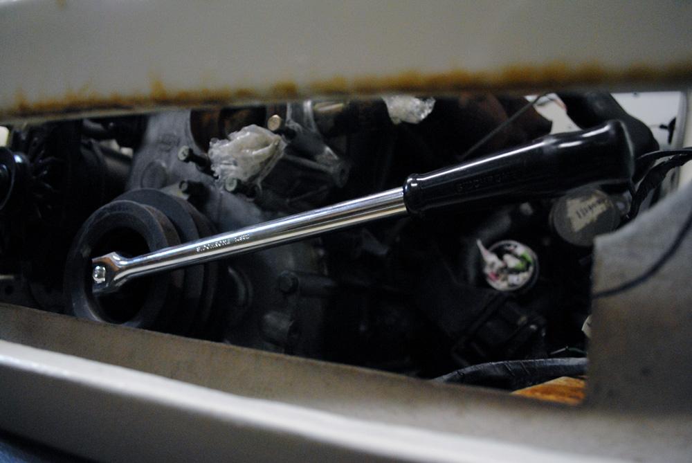 I couldn’t even test fit the radiator, as the thermo fan would be sitting against the crank pulley. My engine only has one belt which goes from the crank pulley, to the (now removed) waterpump, and then to the alternator. The crank pulley has 3 grooves, but I was only using the middle one for my single belt (see this image again for reference), so the front groove was doing nothing and could be sacrificed. I failed to remove the single nut which holds the crank pulley using my air-compressed impact gun, so I asked around and was told about the ‘starter trick’. This involved attaching a socket and breaker bar onto the nut, with the breaker bar handle sitting a few inches above the chassis rail, and then shitting myself while I cranked the engine over with the fuel relay disconnected. This makes the crank rotate and forces the breaker bar to hit the chassis rail where it cannot go any further, bottoming it out and transferring the force onto the nut which then easily un-does itself.