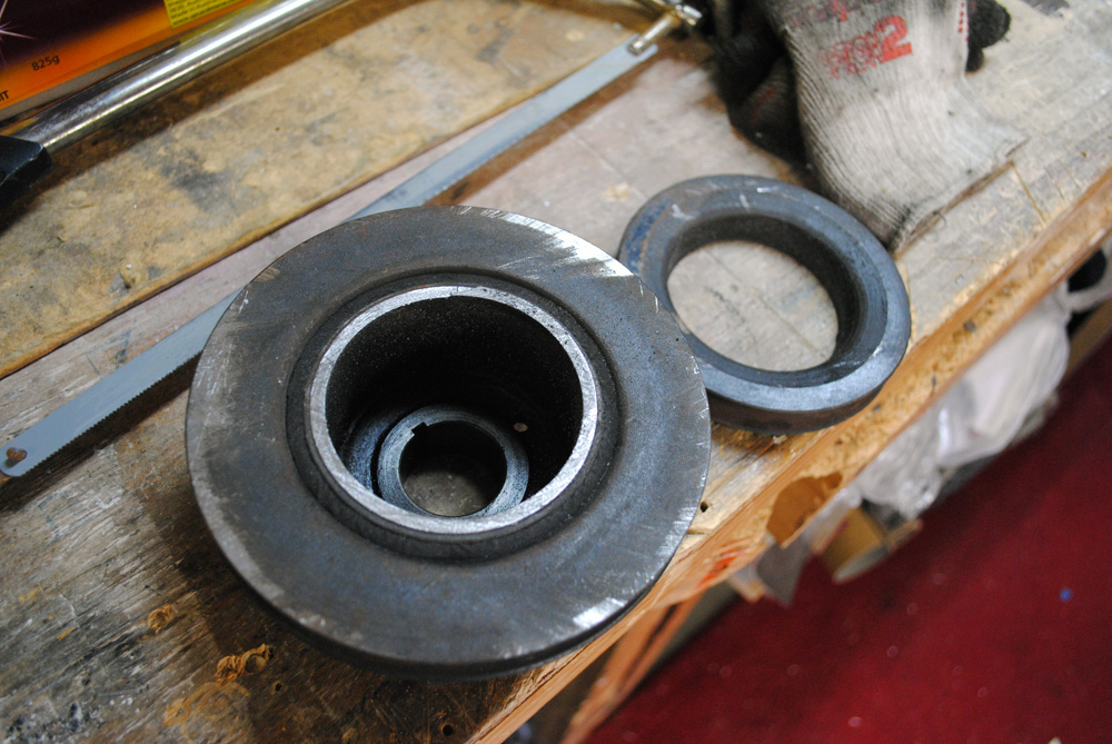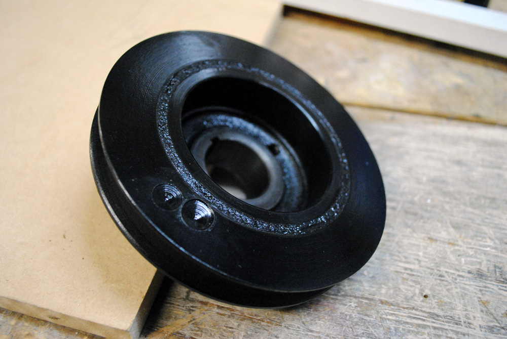 With the pulley removed I was able to cut off the un-needed groove with a hacksaw, as there was a gap between itself and the next groove, so it was easy. After mockup stage I had planned to take the pulley to be professionally re-balanced, but my plans changed. The two remaining grooves are a single piece joined together, and adhered to the center key with a rubber isolator.