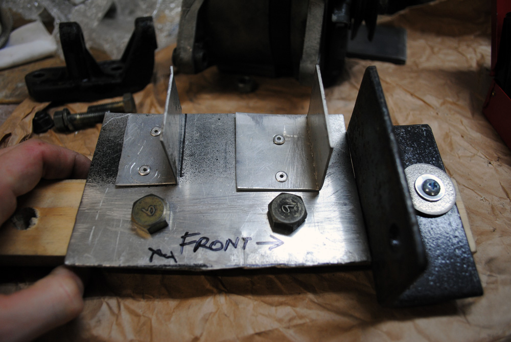 After removing the alternator I inspected the standard mount and started researching how to make a new one. In the end I decided to make it out of 3 pieces of flat plate.