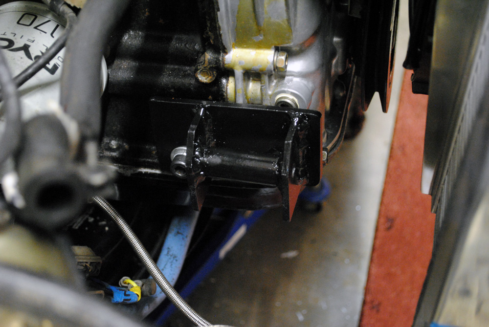 Mounting bracket painted and fitted. You can also see the amount of clearance I gained between the crank pulley and the radiator/thermo fan.