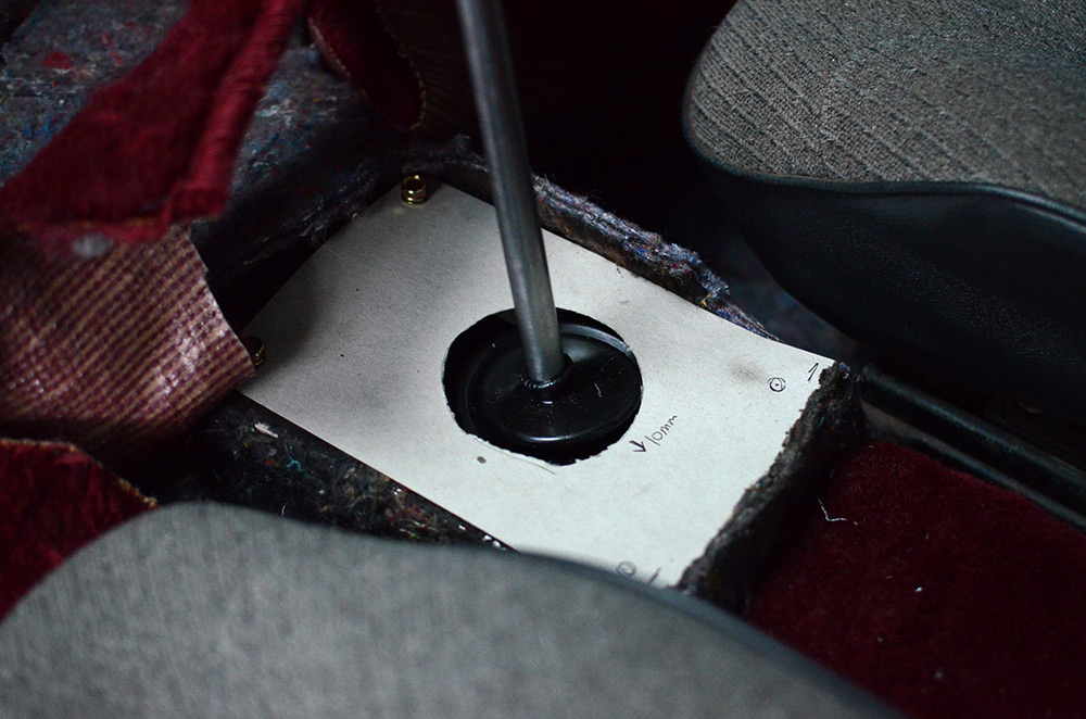 While I was fitting the new shifter, I wanted to address the gear boot situation. What you see above is the temporary solution that Lachy had to come up with when he made the original short shifter. Now that I’ve switched to the older style Datsun gear stick, the stick is thinner, so the gear boot that I was running (to suit the chunkier RB20 shifter), no longer worked, and had to be cut and cable-tied to get somewhat of a seal. The base of it was pop-riveted to a thin sheet of steel, which was in-turn pop riveted to my floor. Now that I was ripping it all apart, I wanted to create a neater and more serviceable solution.