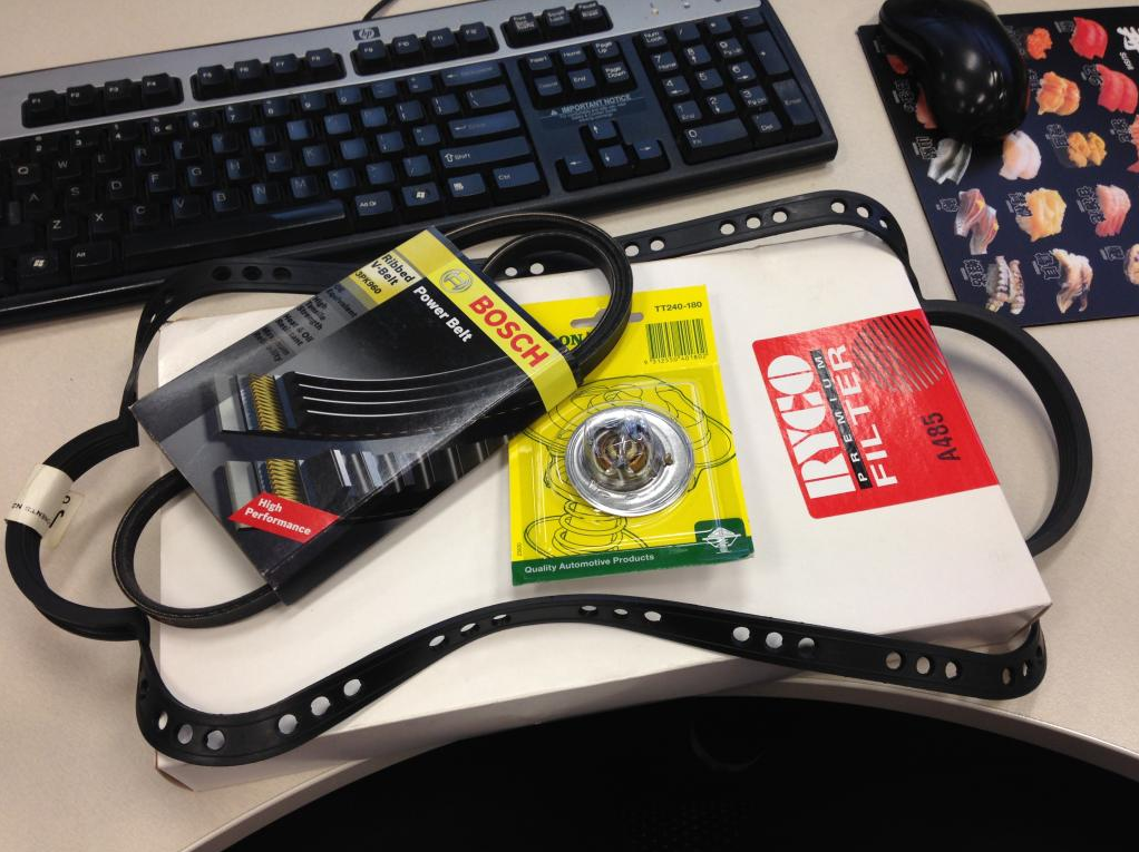Overnight parts from New Zealand: air filter, thermostat, sump gasket and alternator belt.
