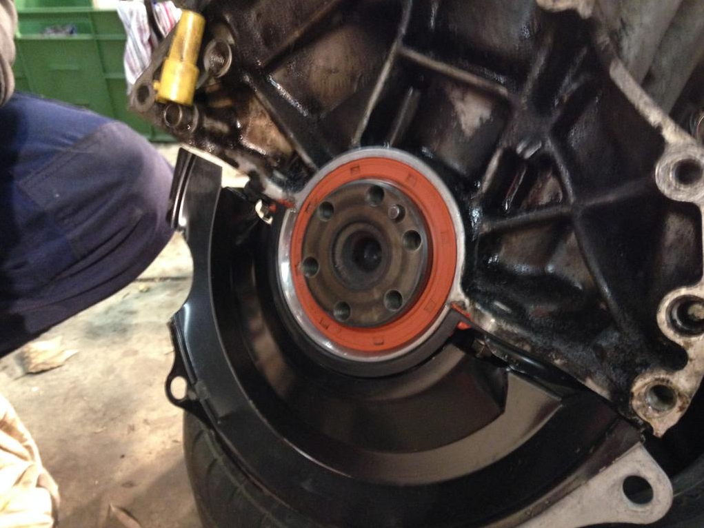 Flywheel torqued to the crank. The flywheel has markings for TDC and 20 degrees advance for setting initial ignition timing.