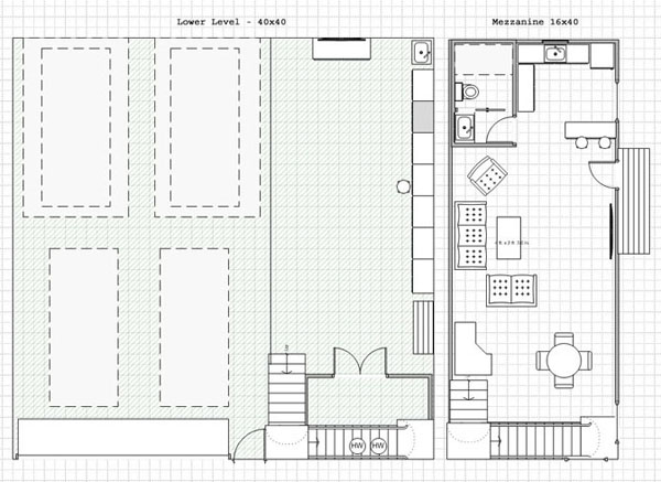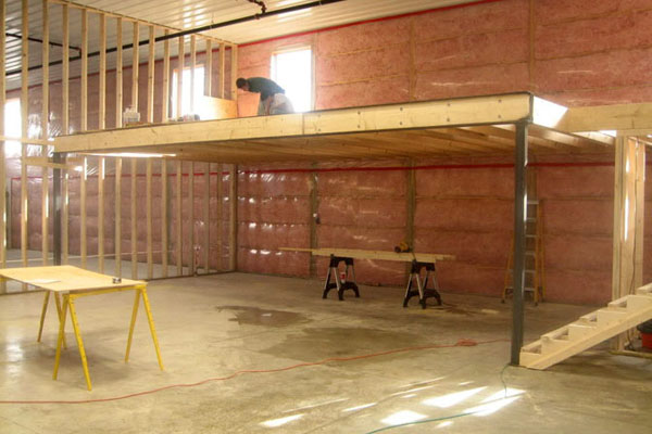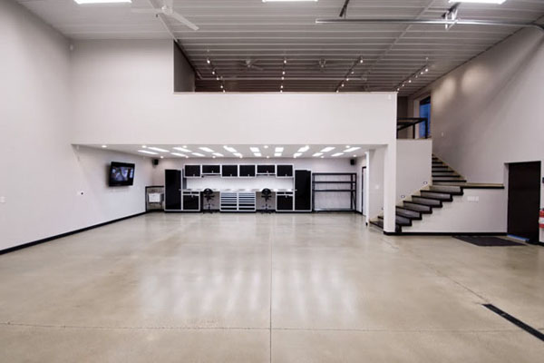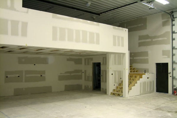 With some plaster on the walls, the overall look, feel and scale of the garage started to come together. The area under the mezzanine is where the tool cabinets will call home.