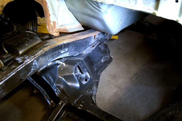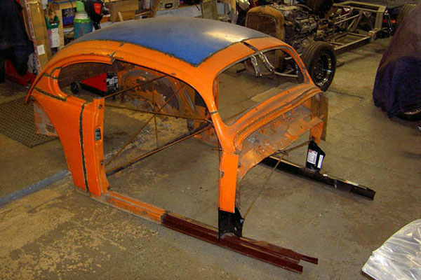 Back to the shell, it was time for the modifications to begin, with the main focal points being the severely chopped roof and lack of any metalwork forward of the A-pillars. Notice all the metal rods tacked inside the shell, this provides bracing and ensures the body doesn’t tweak when the roof is temporarily removed.