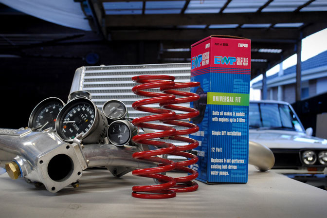 That’s not to say I haven’t been stocking up on some parts for future work. A handy little collection is starting to pile up. There’s a front mount intercooler, an electric water pump, a modified & high-temp coated intake manifold/plenum, a full set of classic Smiths gauges (thank you eBay), another pair of 7″ Ewing III’s, an RB20DET gearbox, and some 250lb front springs. So why haven’t they been fitted yet?…