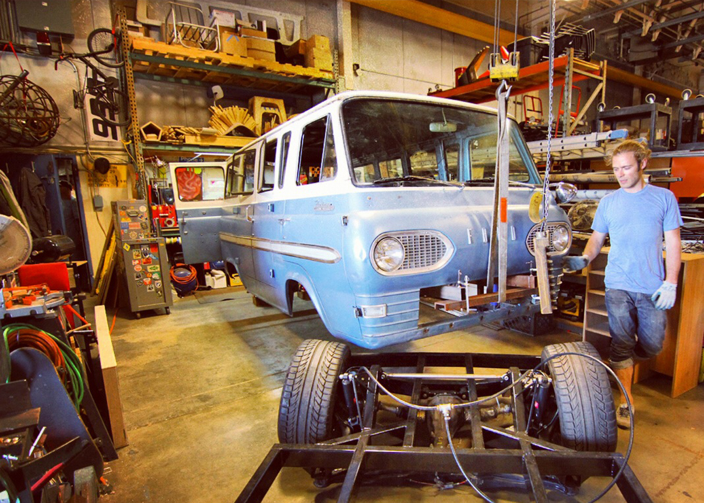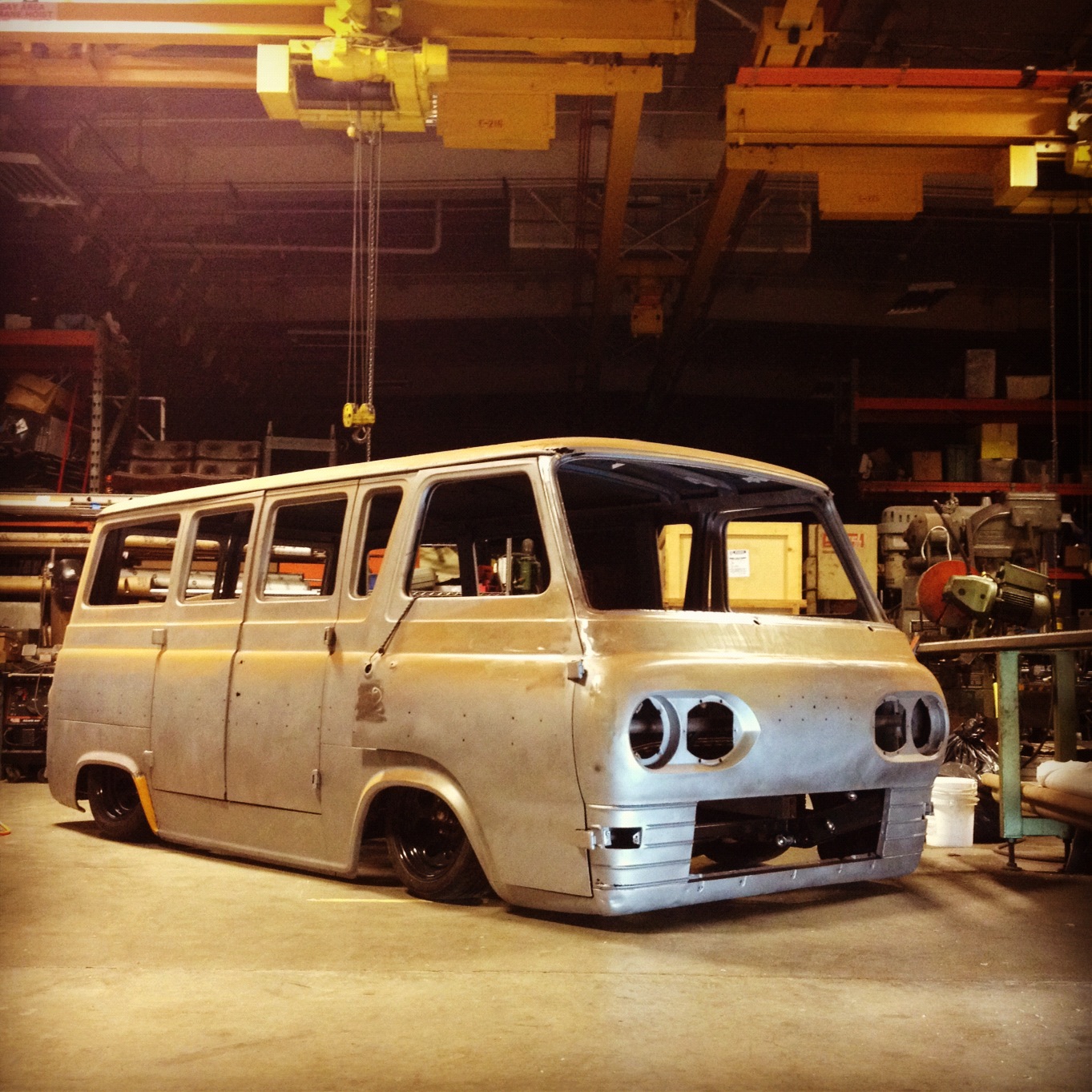 For this build you’ll need to take a step outside of the scene we’re all entrenched in, and see things from a different perspective. Shawn Hibmacronan isn’t your typical hardparking scene-kid, out to get a magazine cover and a tyre sponsorship, far from it. Shawn is an artist, and I’m talking about an actual artist here, not just a guy who doodles in his spare time, but someone who lives his life creating mechanically-influenced sculptures. His latest project, however, finds him crossing over into our world; an aired-out ’63 Ford Econoline with a VW TDI engine swap. Shawn’s philosophy for the car is a bit different from what we’re used to, and that’s what I love about it. It’s refreshing to hear someone from a different subculture talking about a process we’ve become so accustomed to. Another interesting element of this build is that Shawn has started a Kickstarter campaign to help funding, now why didn’t I think of that?!