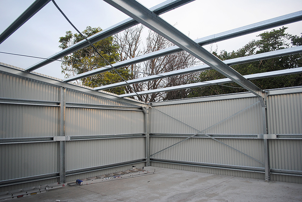 Once the back wall was complete, we worked our way from back to front on the side walls. Because of the pitch of the roof, we had to cut every sheet to match the roof profile.